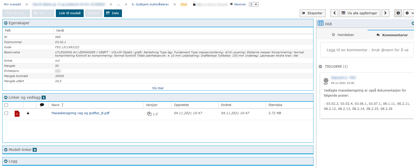 Skjermbilde av et godkjent sluttmålebrev med kommentar og vedlegg (Klikk for å forstørre bildet)