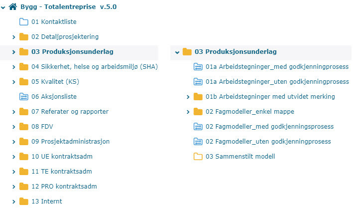 Her kan byggherren velge to oppsett med tilpassede strukturer, prosesser og funksjonalitet. Generalentreprise, for prosjekter der byggherren forholder seg til én utførende entreprenør eller Delt Entreprise, der byggherren forholder seg til flere entreprenører.